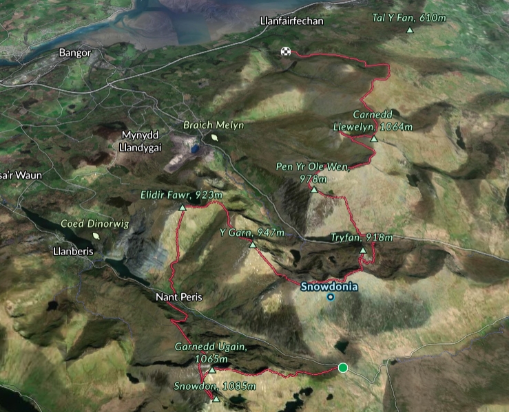 After a few summit photos we descend following the railway track before turning east descending into the Llanberis Pass to the road at Nant Peris. We then begin to climb back up the other side into our second mountain range of the challenge – The Glyders. Skirting the vast slate quarries, we ascend onto the shoulder above Cwm Dudodyn to the summit of Elidir Fawr (Great Elidir, 3031ft/923m), the northernmost peak in the Glyderau.